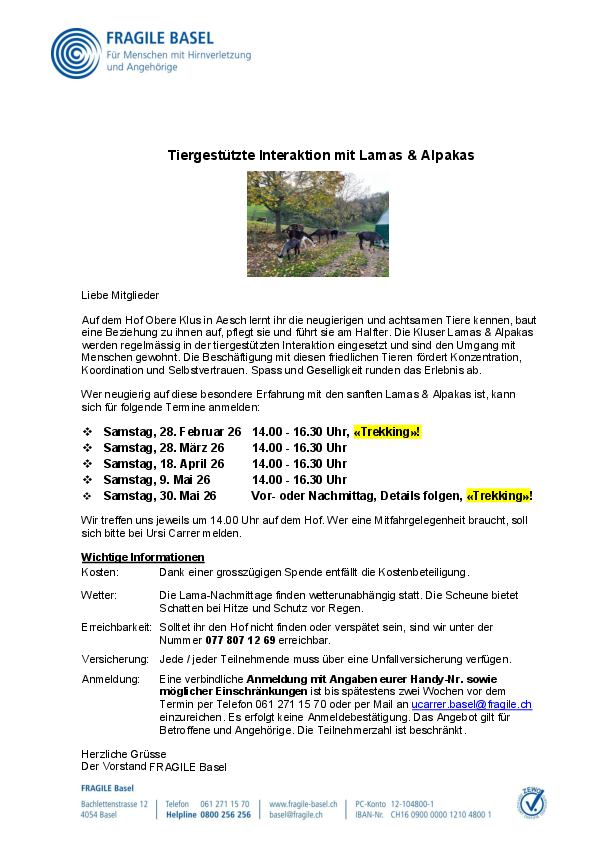 Auf dem Hof Obere Klus in Aesch, mit den Kluser Lamas & Alpakas, können Interessierte unter der fachkundigen Leitung von Astrid Körner und der Besitzerin Daniela Tschaggelar Wissenswertes über Lamas/Alpakas erfahren. Sie lernen die neugierigen und…