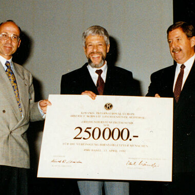 Le 23 juin 1990, l’Association suisse pour les traumatisés craniocérébraux (ASTCC) voit le jour à l’Hôpital de l’Île à Berne. Elle reçoit de la part de Kiwanis Suisse un capital de départ de 250 000 francs. L’ASTCC prendra officiellement le nom de «FRAGILE Suisse» en 1996, sans modification du statut juridique. Le neurologue Peter Zangger (au milieu) est le premier président de l’organisation. Il est aujourd’hui président d’honneur. L'ASTCC installe ses bureaux à Winterthour, dans un appartement de deux pièces. Celui-ci est situé dans le même immeuble que l’ancienne caisse-maladie de l’entreprise Sulzer. A l’époque, aucune association régionale n’est encore constituée, bien qu’il existe déjà des groupes d’entraide actifs dans certaines régions.
