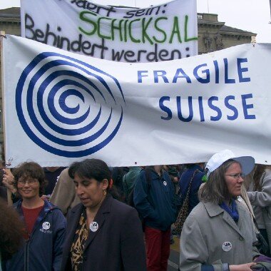 Des employés et des membres de FRAGILE Suisse ont manifesté le 26 avril 2003 sur la Bundesplatz à Berne. Avec les 4 500 autres personnes présentes, nous avons appelé à un oui à l'initiative «Droits égaux pour les personnes handicapées» qui militait pour l'égalité des droits pour les personnes handicapées.
