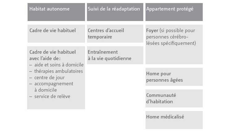 Un séjour en clinique de réadaptation peut durer plusieurs semaines et même plusieurs mois. Des échanges réguliers avec les spécialistes sur place vous permettront d’avoir une estimation de la durée du séjour. Lorsque le départ est envisageable, une discussion entre la personne concernée, ses proches et les spécialistes est nécessaire. Il est important de réfléchir à la forme de logement la plus adaptée aux besoins de la personne. Est-il possible de rentrer chez soi? Ou le placement dans une institution est-il la meilleure solution? Si vous avez des questions ou des problèmes à ce sujet, vous pouvez également vous adresser à tout moment aux services sociaux de l'institution, à FRAGILE Suisse, à Pro Infirmis ou Pro Senectute.
