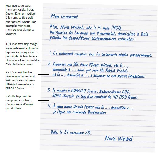 « Il me tient particulièrement à cœur d'aider, dans la mesure de mes moyens, les personnes qui, pour une raison quelconque, ont subi une lésion cérébrale. Je le fais notamment en léguant une partie de ma fortune à Fragile Suisse dans mon testament. »