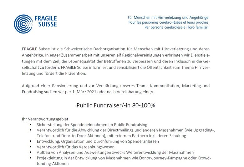 In unserem Kommunikations-, Marketing- und Fundraising-Team haben wir per 1. März 2021 oder nach Vereinbarung eine spannende Stelle als Public Fundraiser/-in zu besetzen.