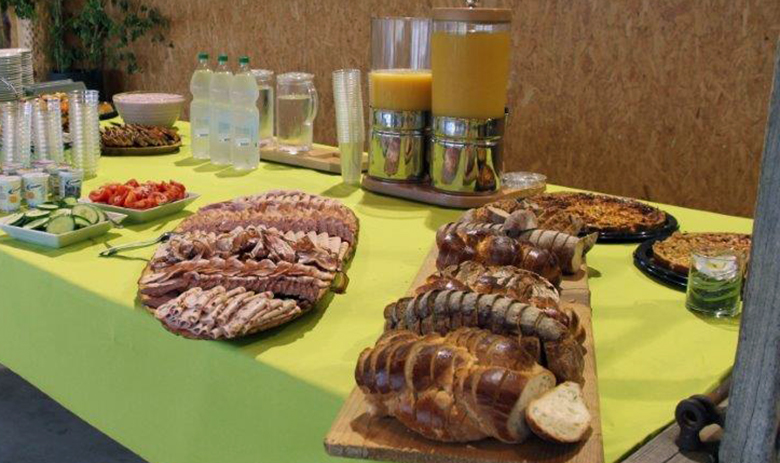 Drei Personen stehen hinter einem vielfältig angerichteten Frühstücksbüffet.